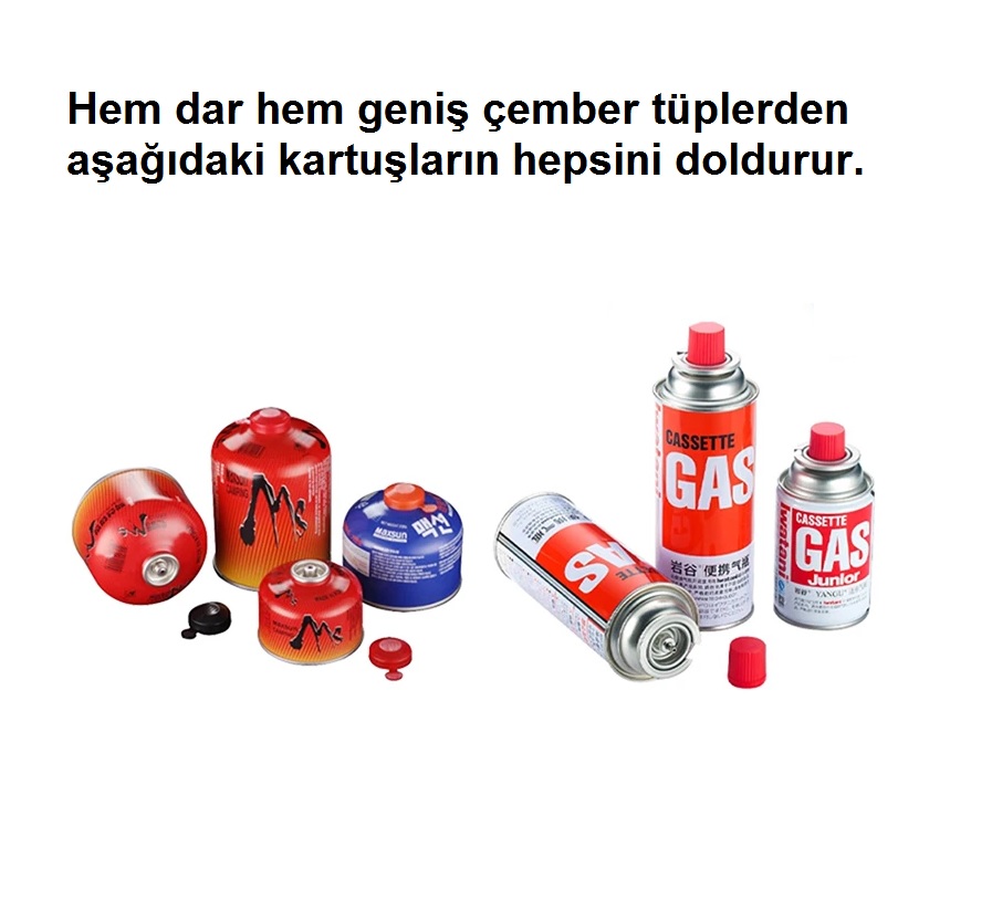 Kamplarda kullanılan tek kullanımlık kartuşları doldurmaya yarayan setler. Kamp tüpü doldurma seti. Kamp tüpü doldurma aleti. Kamp kartuşu duldurma aletleri. Kamp Kartuşu doldurma seti.