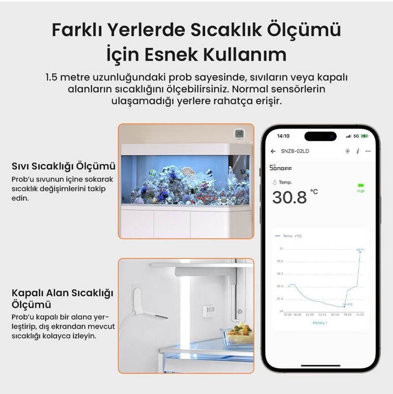 SNZB-02LD, 1.5 metrelik probu sayesinde sıvıların içinde veya kapalı alanlarda doğrudan sıcaklık ölçümü yapabilen, IP65 korumalı akıllı sıcaklık sensörüdür. Geniş ekranı ve Zigbee 3.0 uyumluluğu ile gerçek zamanlı takip ve veri kaydı artık çok daha kolay.
