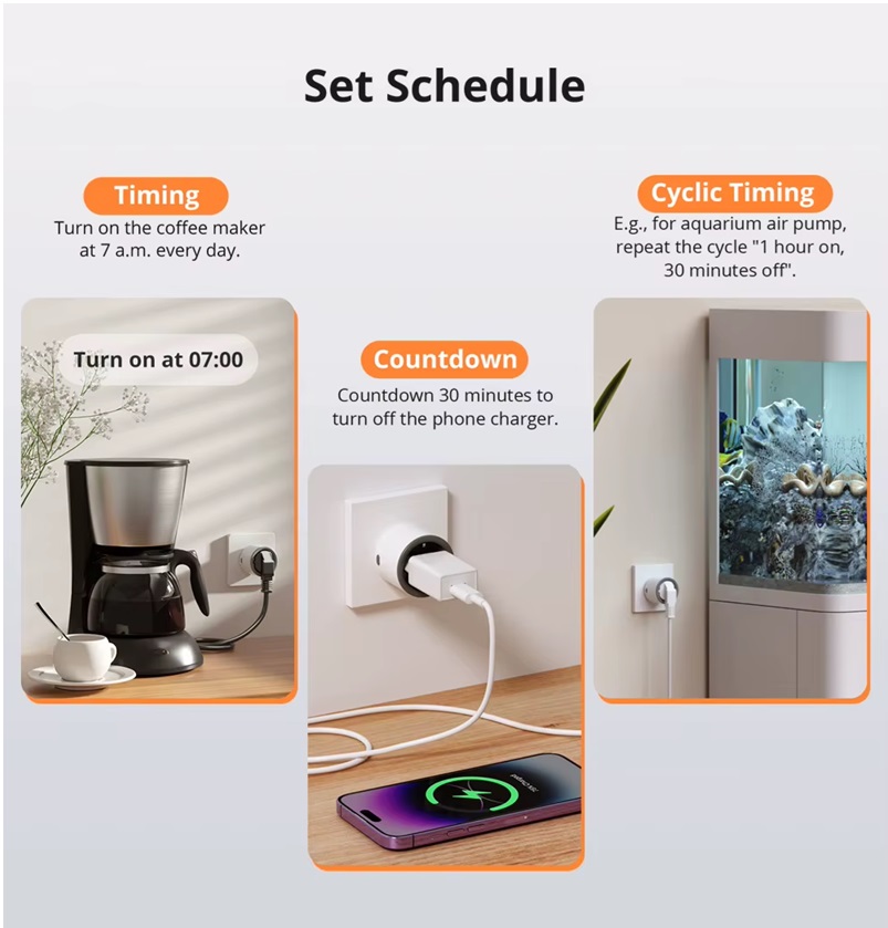 Uygulama ve Sesli Kontrol: eWeLink uygulaması üzerinden istediğiniz zaman, istediğiniz yerden S60 akıllı prizi kontrol edin veya Alexa veya Google’a sesli komutlar verin.