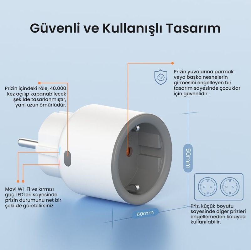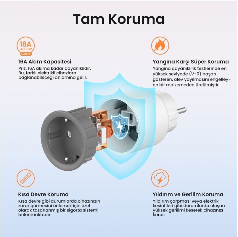 Güvenli: En yüksek alev geciktiricilik özelliğine sahiptir, mükemmel dayanıklılığa sahiptir, aşırı yüklenmeye, kısa devreye, yıldırım ve gerilim dalgalanmalarına karşı koruma sağlar. Çocuk güvenliği özelliği, çocukların parmaklarını veya diğer nesneleri prizin yuvalarına sokmasını önler.