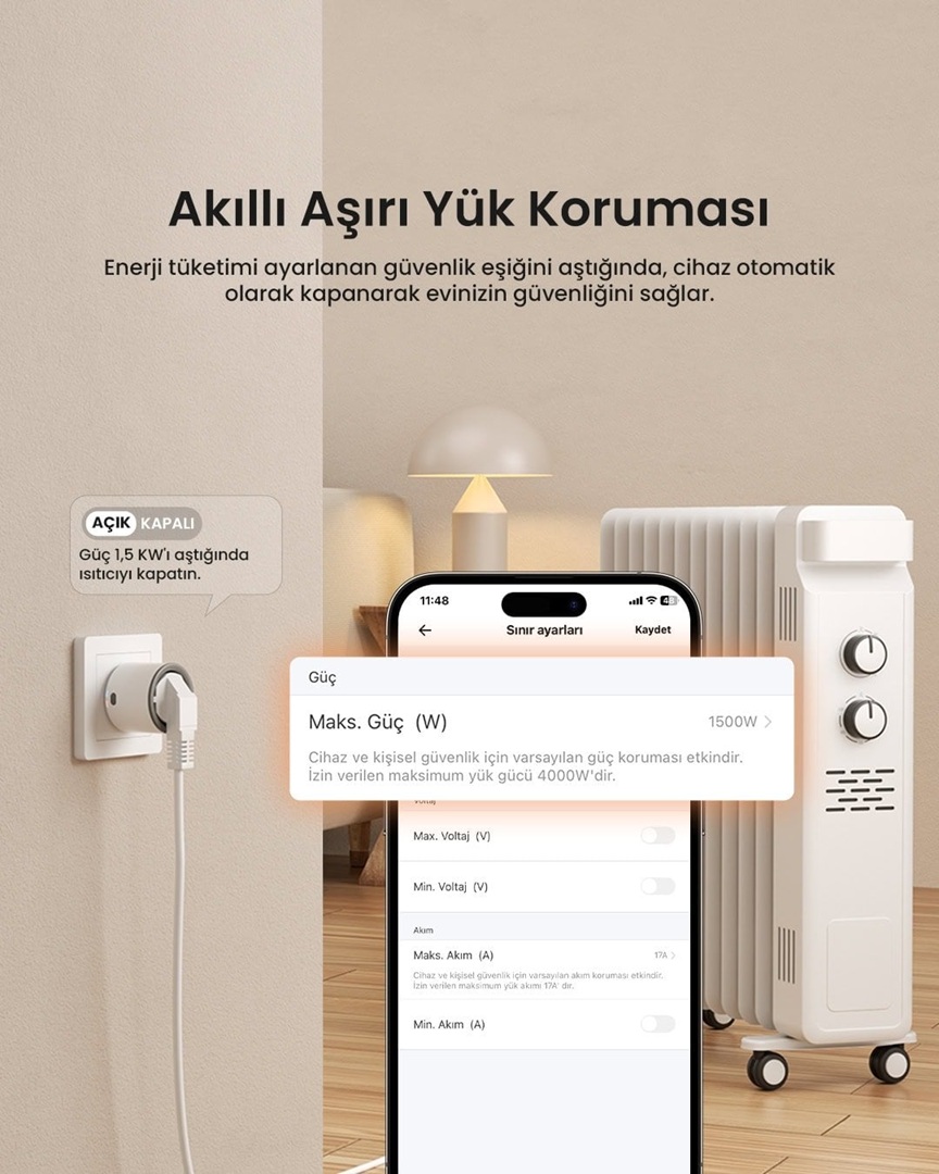 Akım Koruma: Aşırı akım tespit edildiğinde S60 Zigbee Akıllı Priz, cihazlarınızı korumak için gücü otomatik olarak keser. Bu sayede cihaz hasarını önler ve güvenli kullanım sağlar.