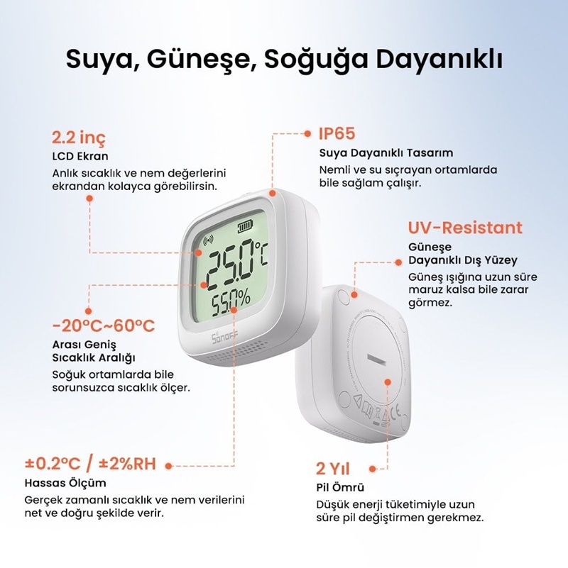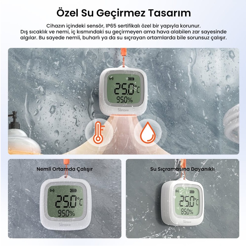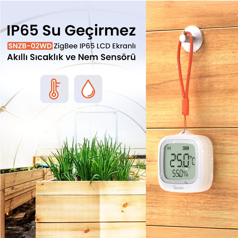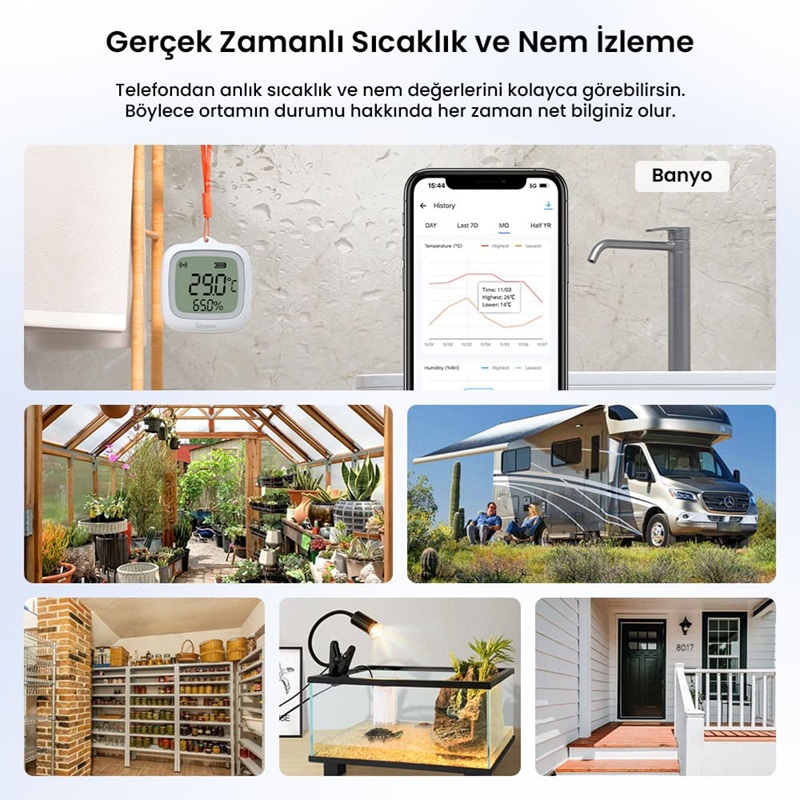 Bahçeden teraryuma, dış mekandan seraya kadar pek çok alanda güvenle kullanılabilen bu akıllı sensör; nemli, tozlu veya sıçramaya açık ortamlarda bile hassas sıcaklık ve nem takibi sunar.