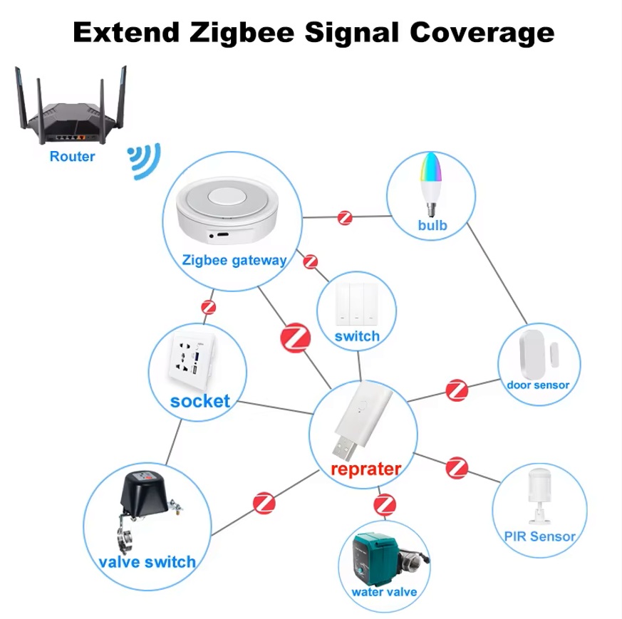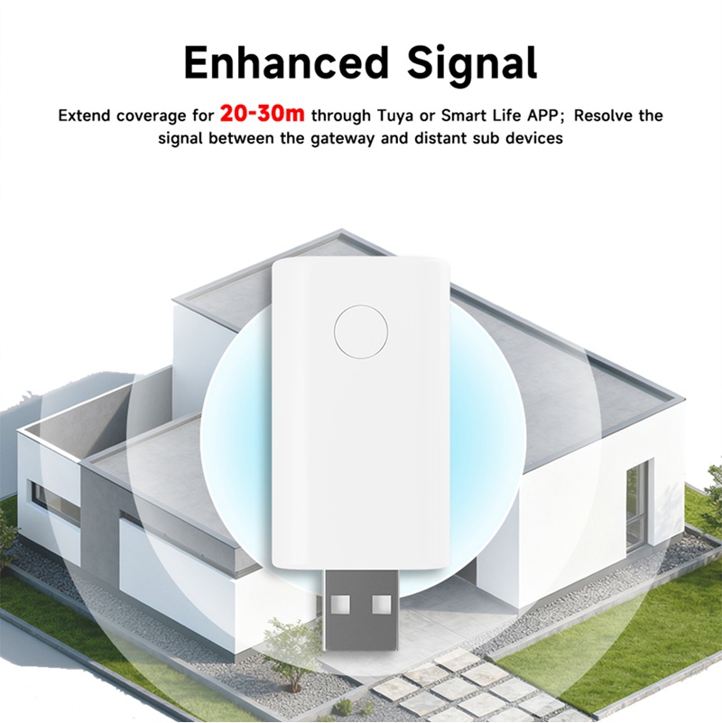 Akıllı ampuller, sensörler, vanalar, anahtarlar ve diğer zigbee cihazların Zigbee Hubdan uzak kalma durumunda kullanılan tuya zigbee sinyal genişletici, zigbee ağını genişleterek bu cihazların birbirleriyle daha sağlıklı ve sürekli bağlanmasını sağlar.